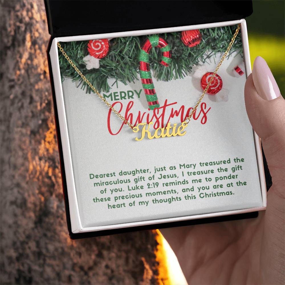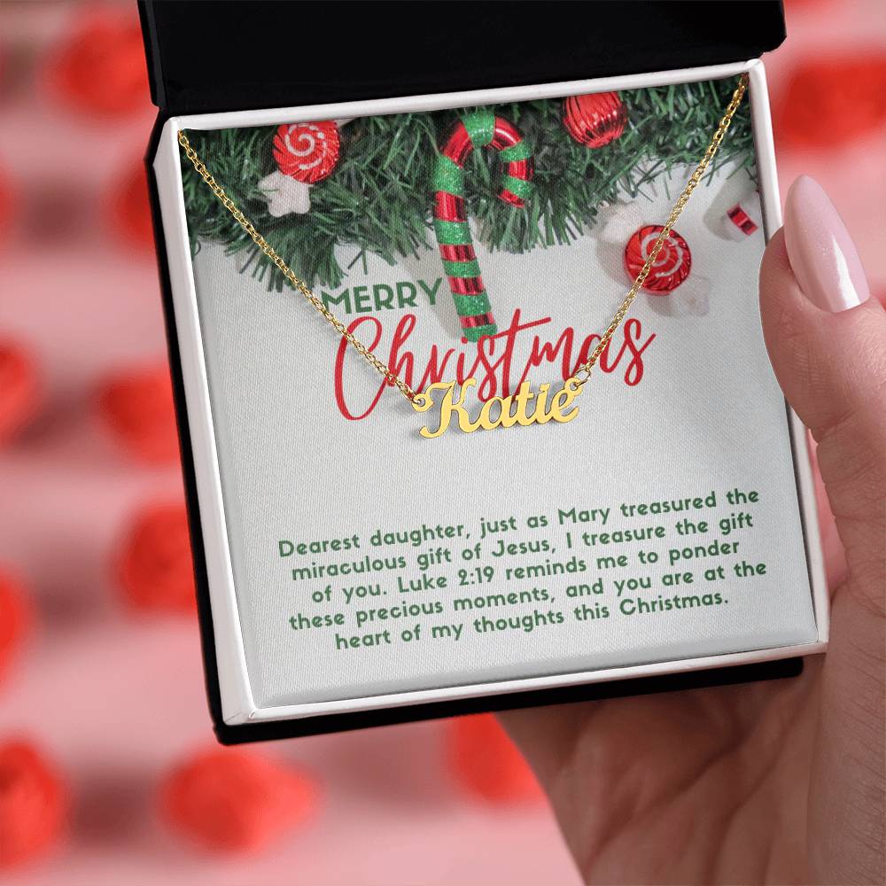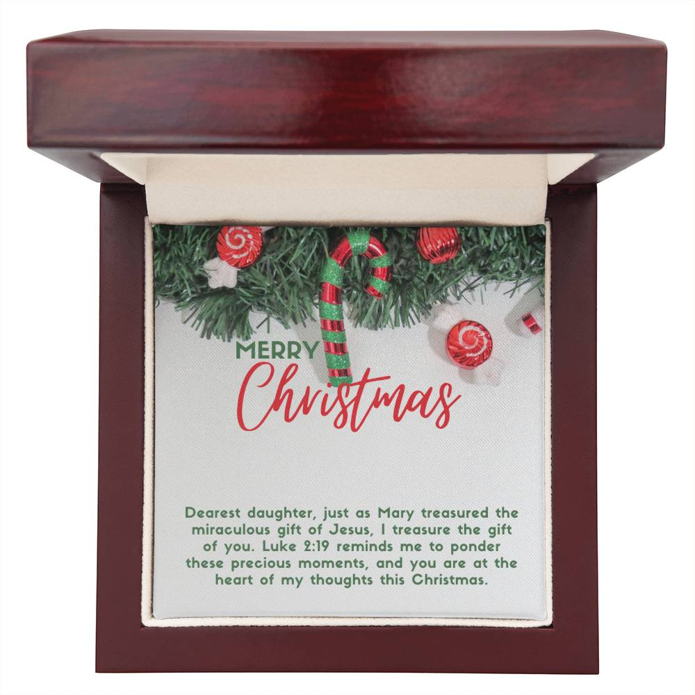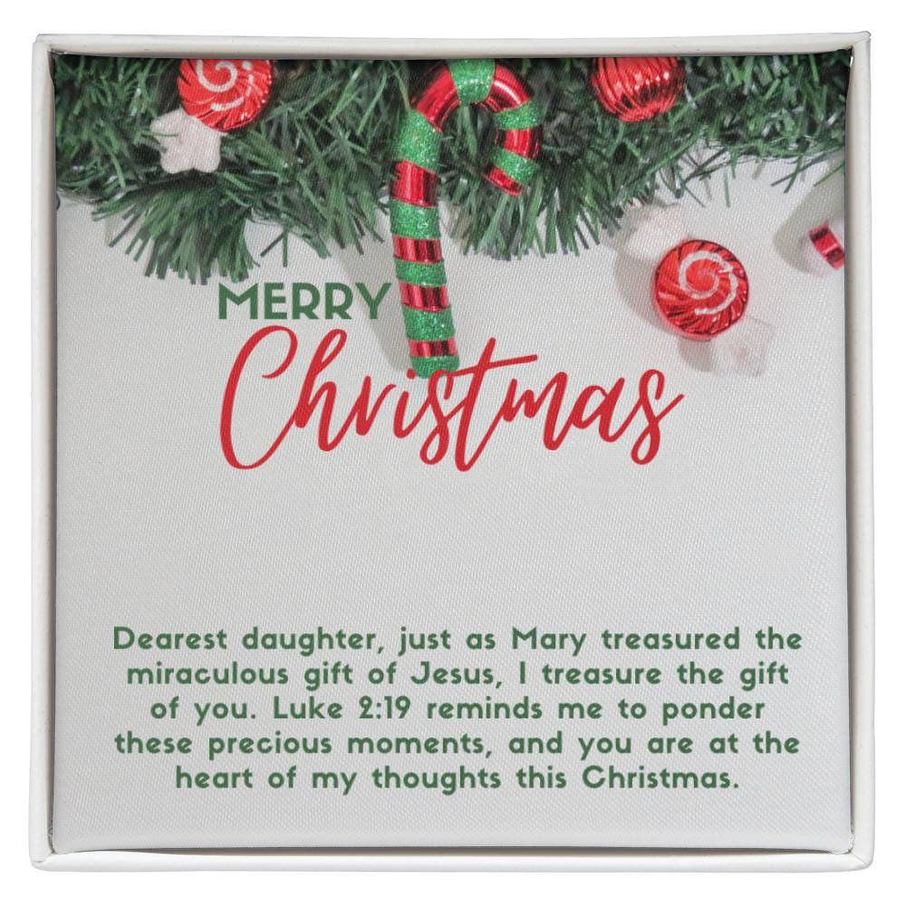 Message card text: Dearest daughter, just as Mary treasured the miraculous gift of Jesus, I treasure the gift of you. Luke 2:19 reminds me to ponder these precious moments, and you are at the heart of my thoughts this Christmas.