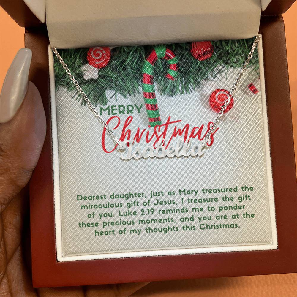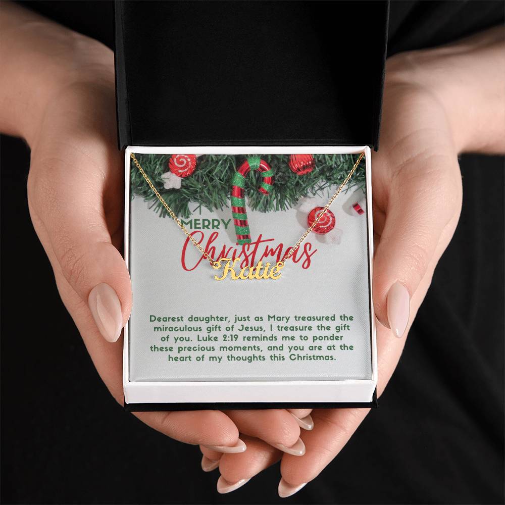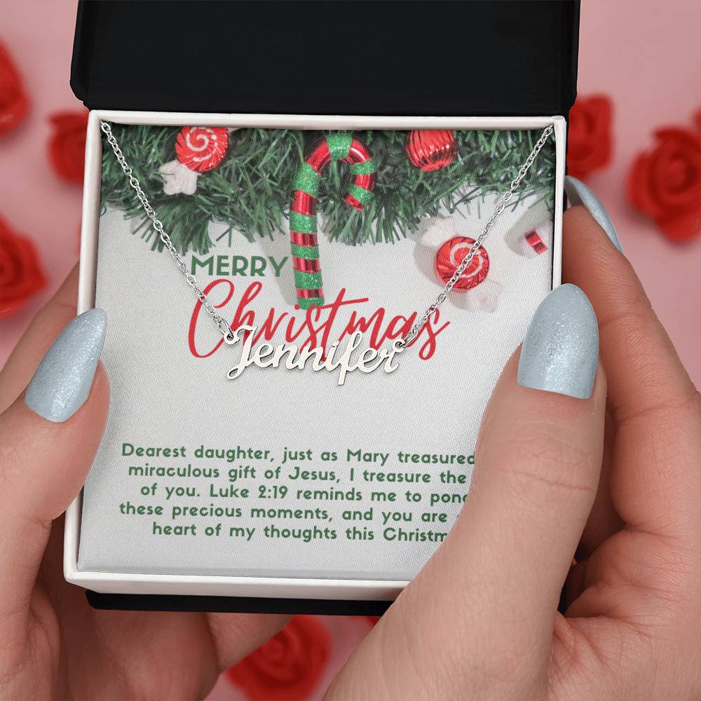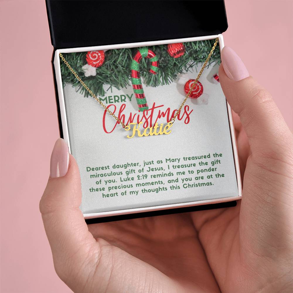 Message card text: Dearest daughter, just as Mary treasured the miraculous gift of Jesus, I treasure the gift of you. Luke 2:19 reminds me to ponder these precious moments, and you are at the heart of my thoughts this Christmas.