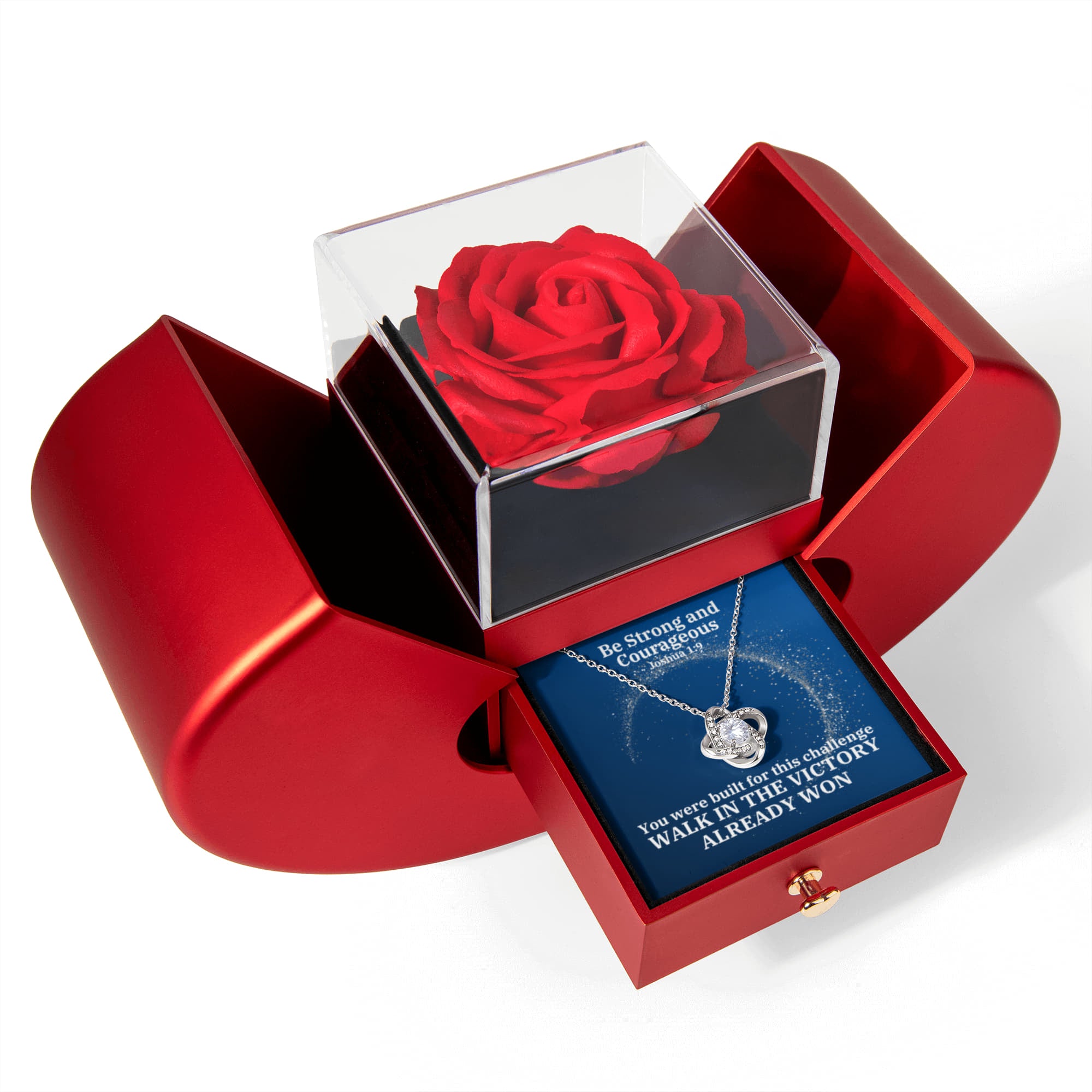 Be Strong And Courageous (Joshua 1:9) | Love Knot Necklace in Red Heart Rose Box