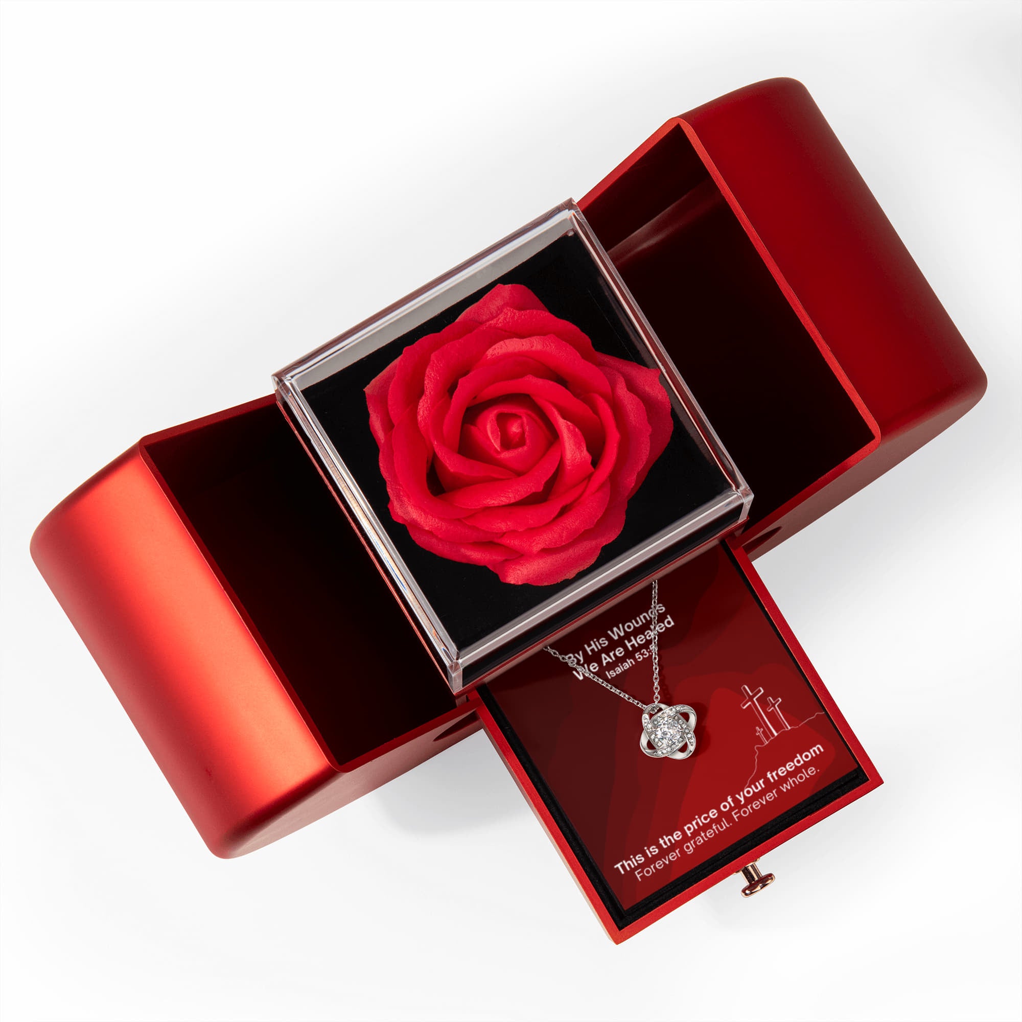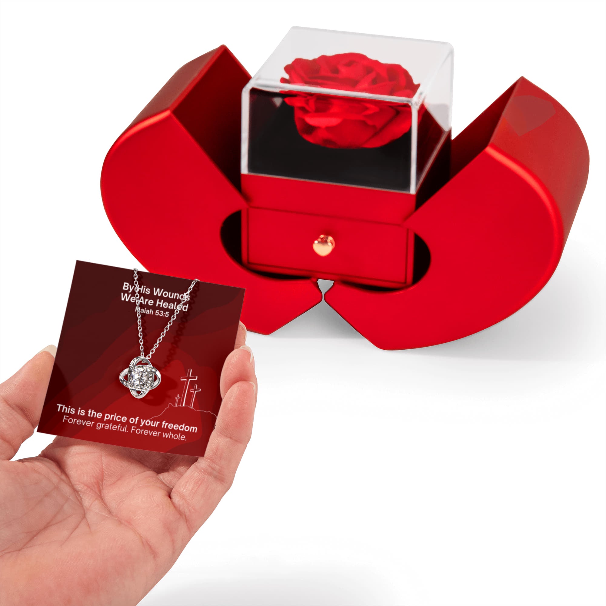 By His Wounds We Are Healed (Isaiah 53:5) | Love Knot Necklace in Red Heart Rose Box