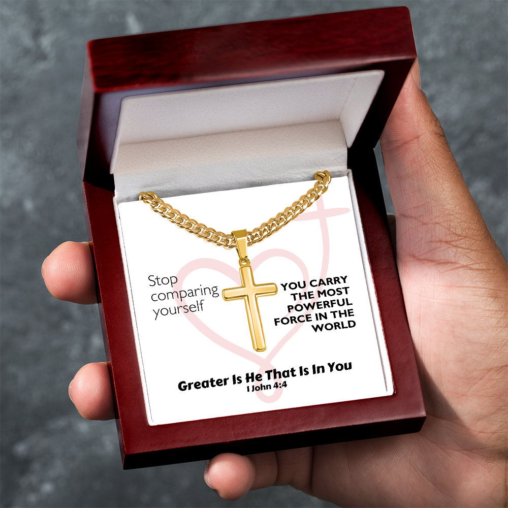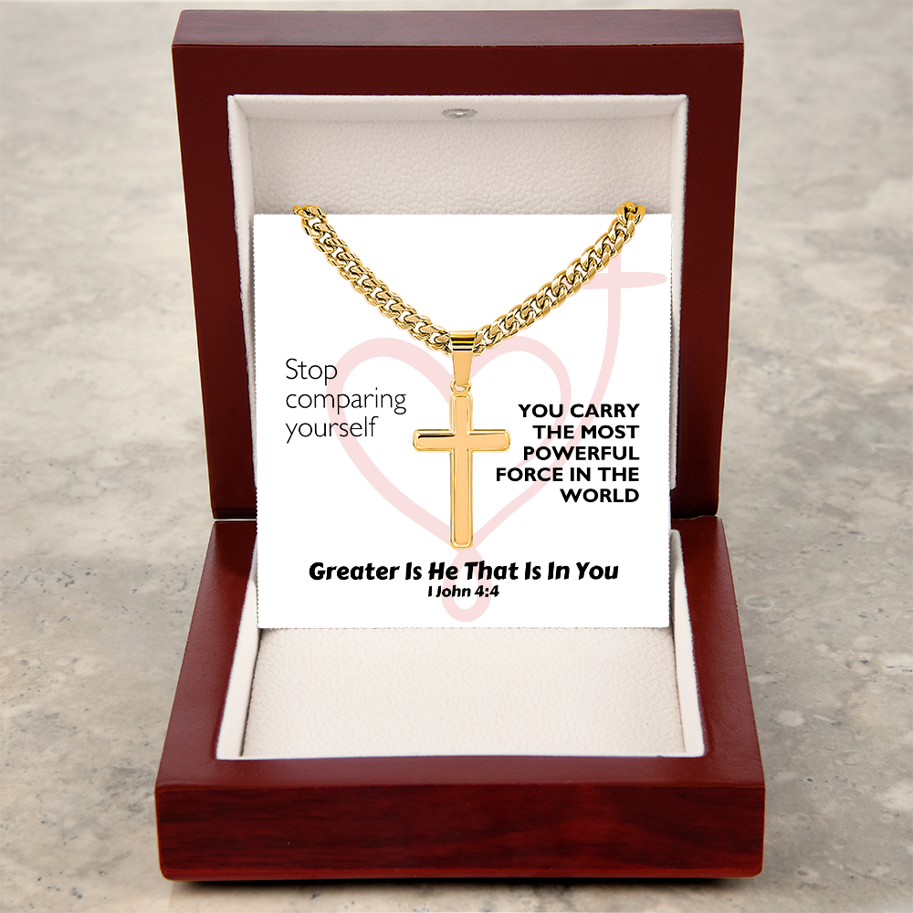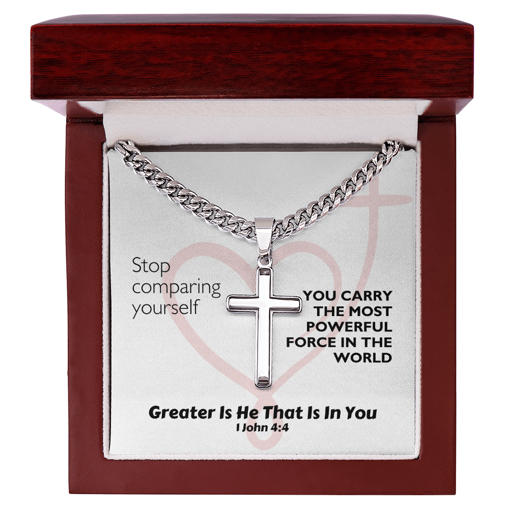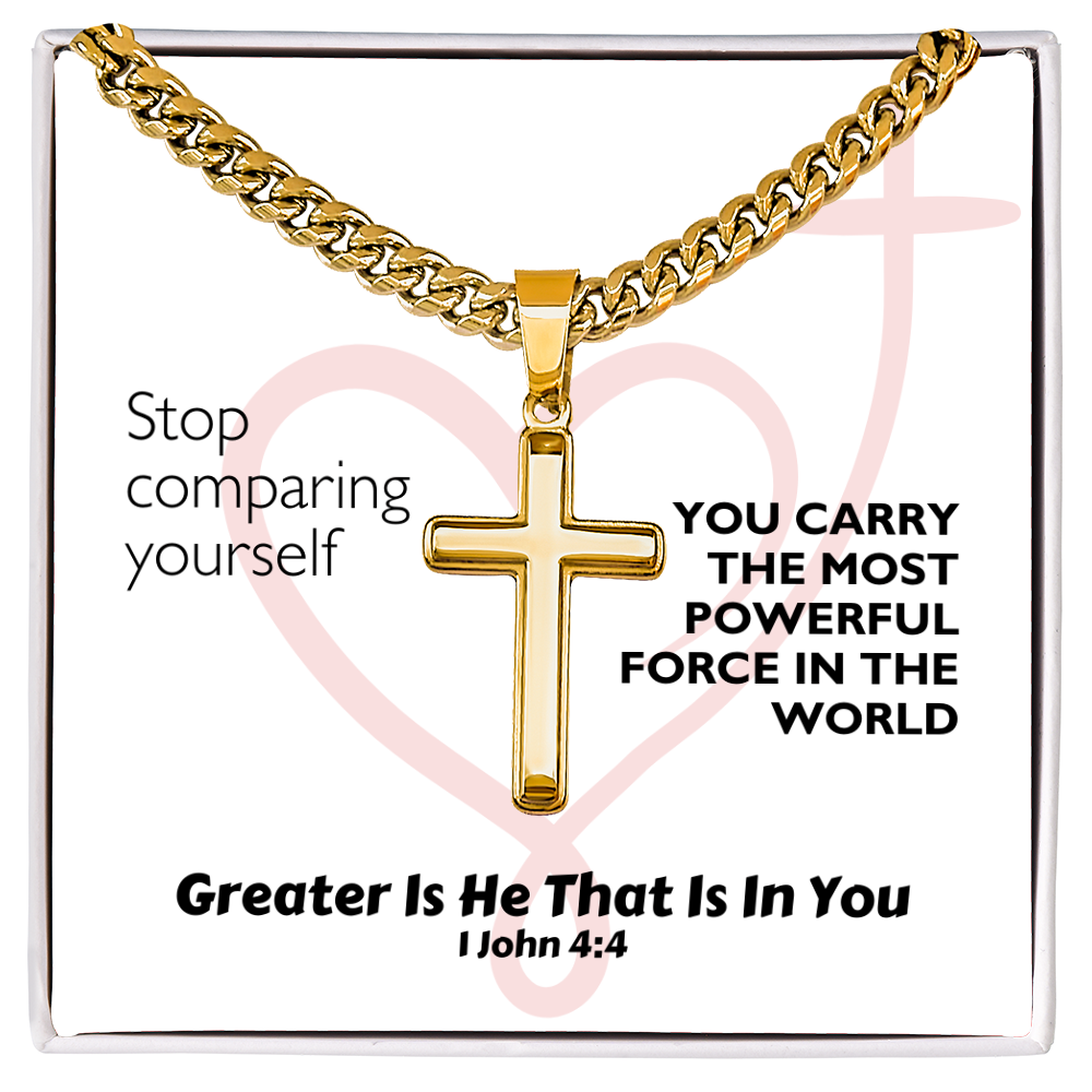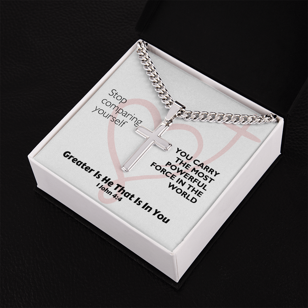 Greater Is He That Is In You (1 John 4:4) | Premium Sterling Silver Cuban Link Cross Necklace