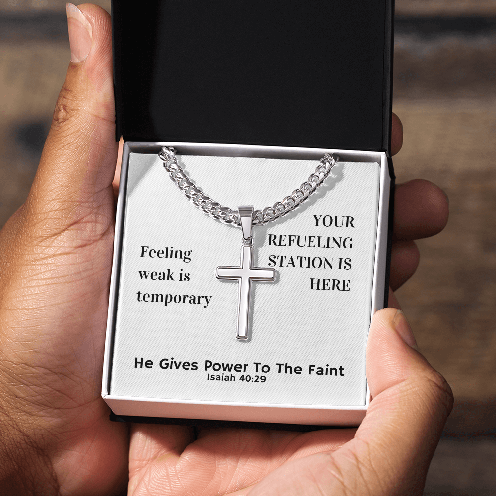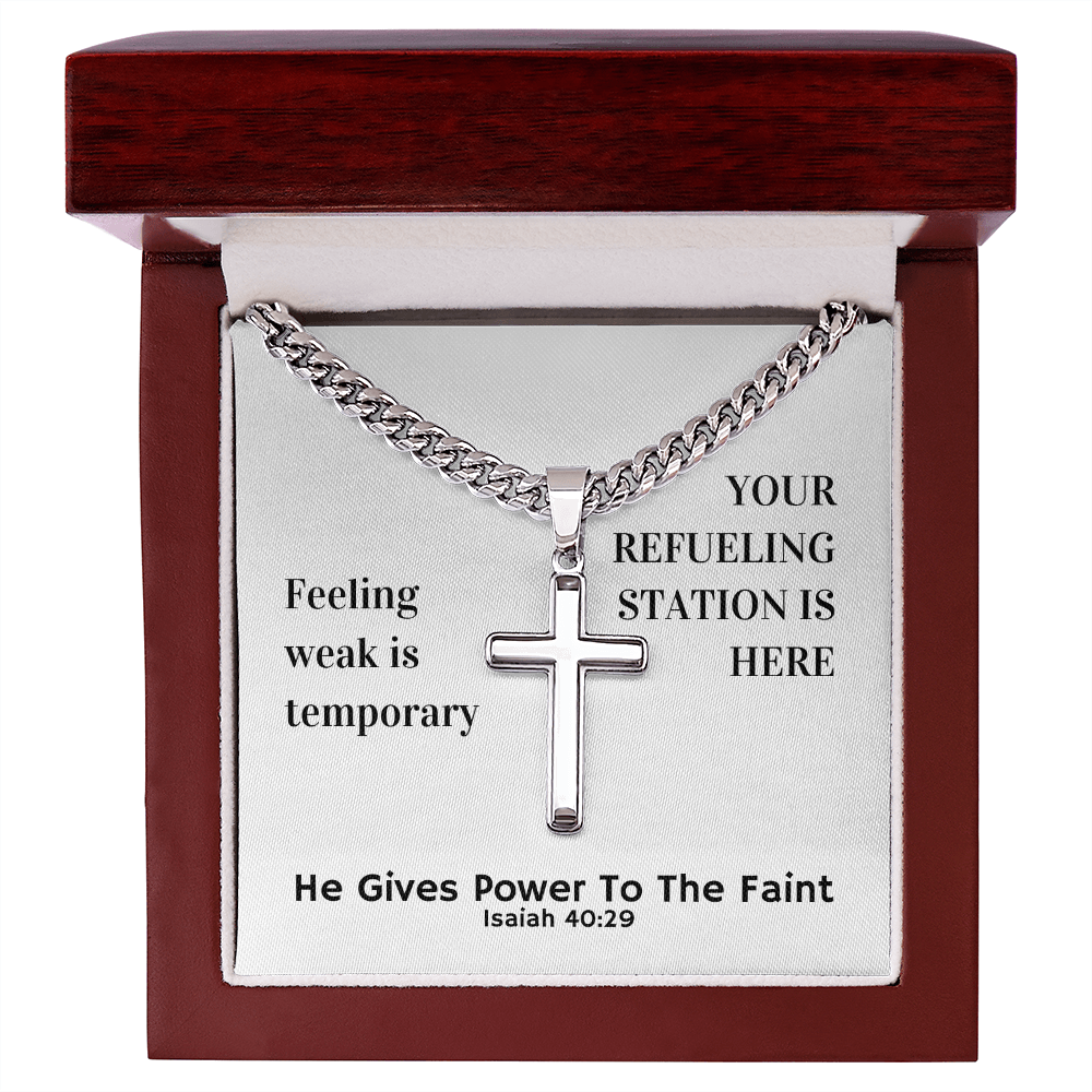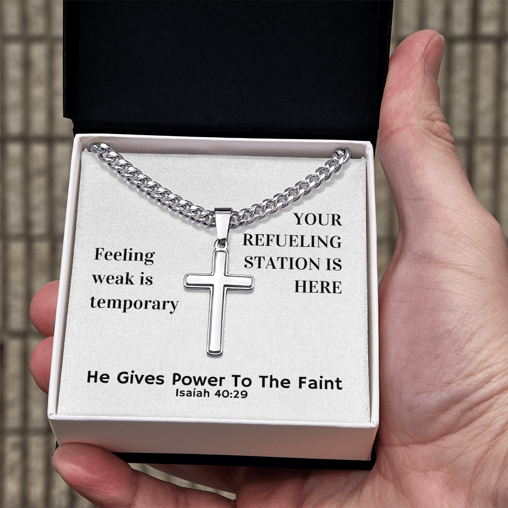 He Gives Power To The Faint (Isaiah 40:29) | Premium Sterling Silver Cuban Link Cross Necklace