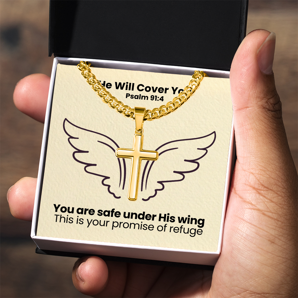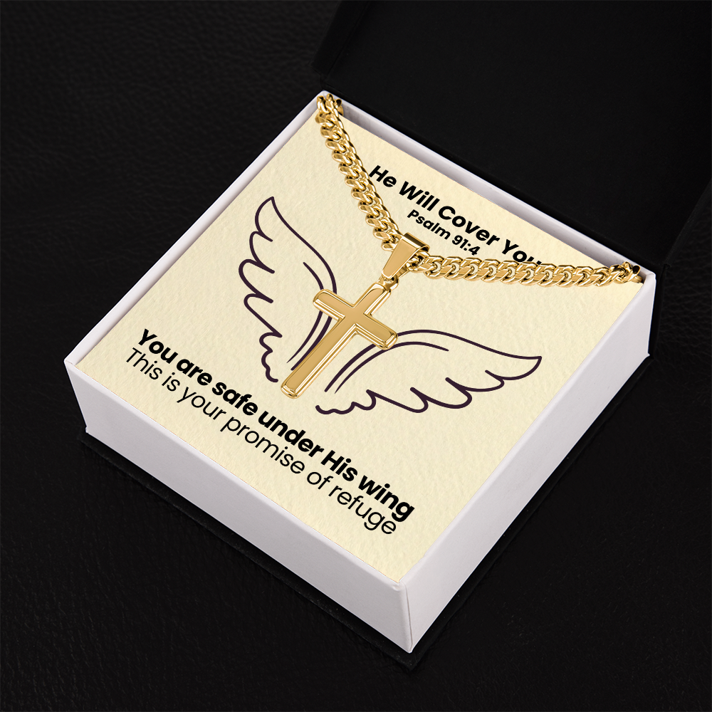 He Will Cover You (Psalm 91:4) | Premium Sterling Silver Cuban Link Cross Necklace