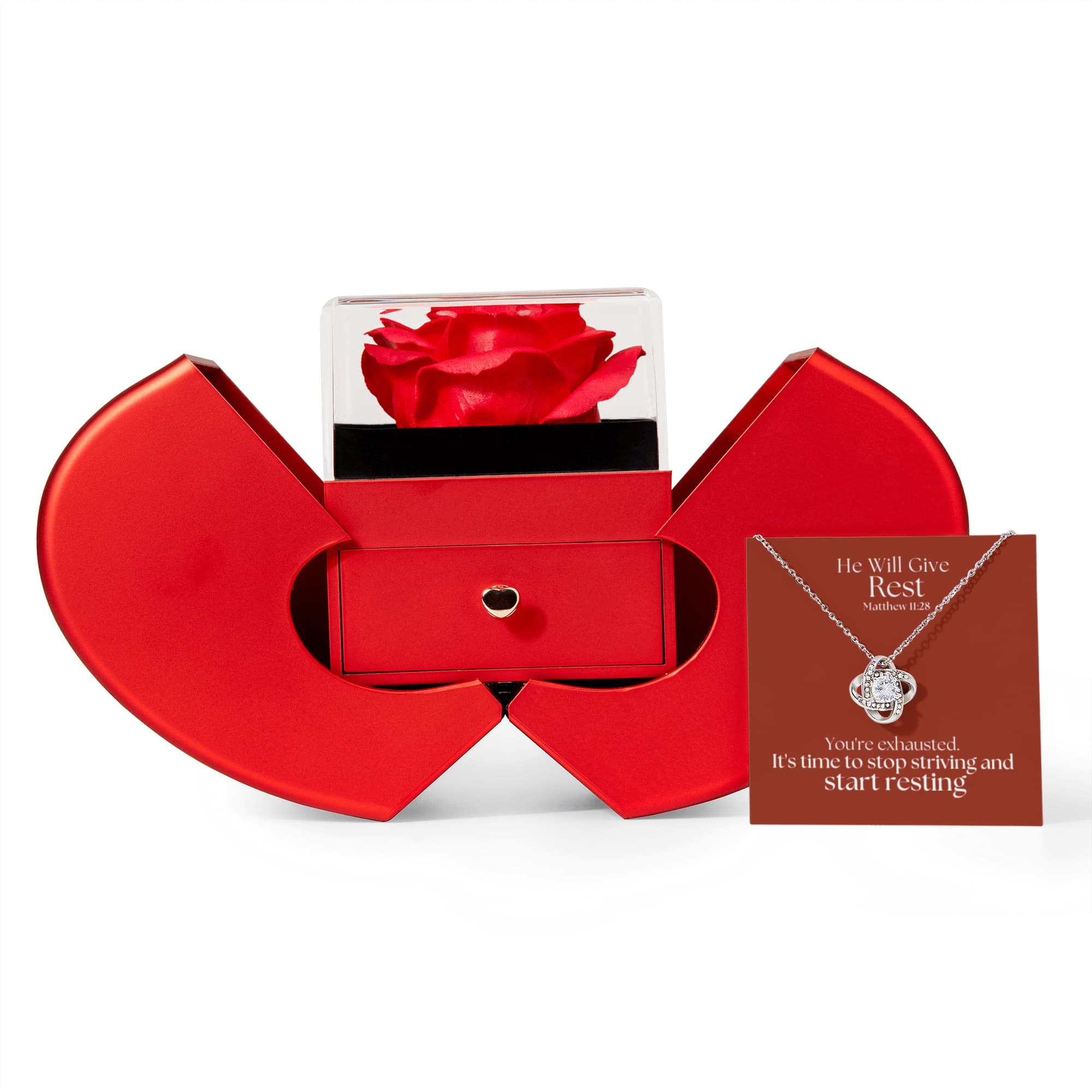 He Will Give Rest (Matthew 11:28) | Love Knot Necklace in Red Heart Rose Box