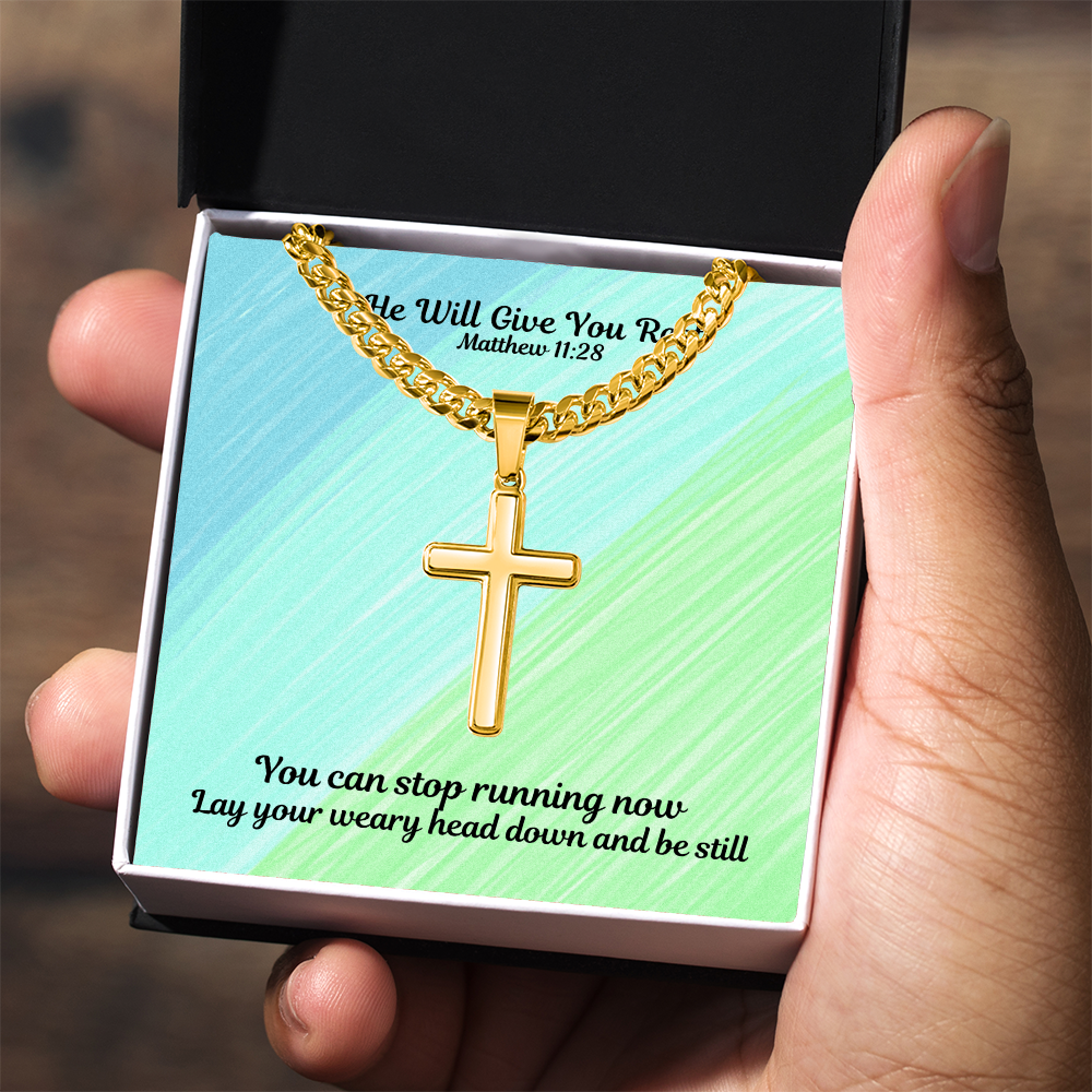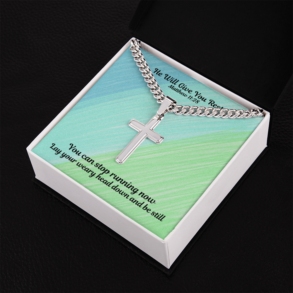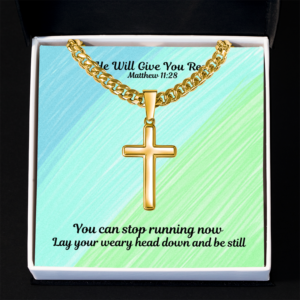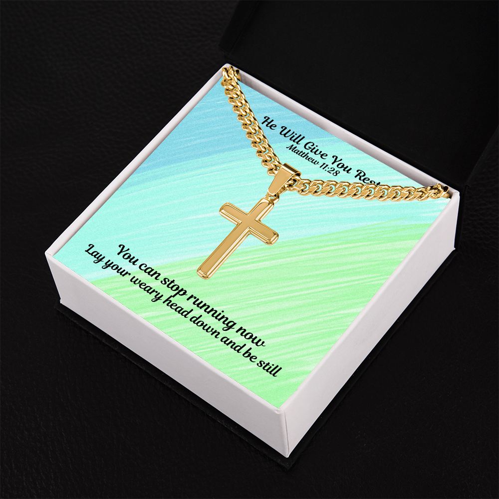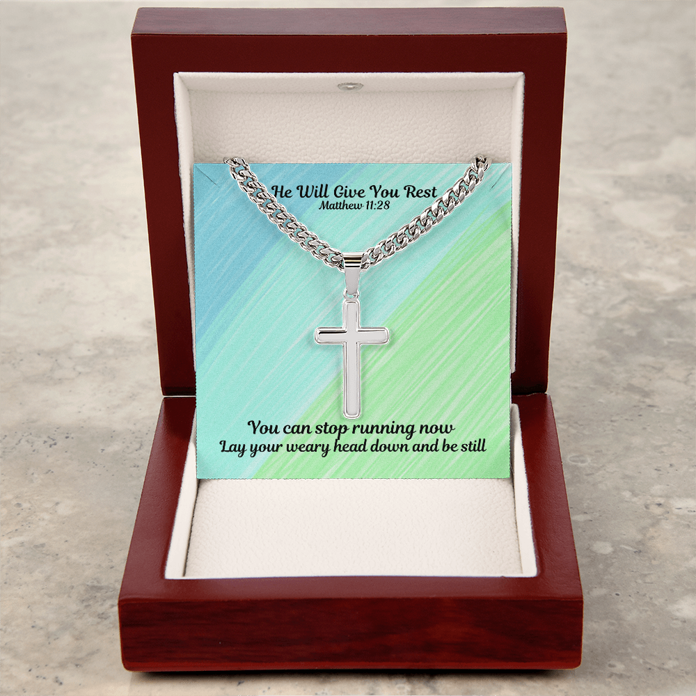 He Will Give You Rest (Matthew 11:28) | Premium Sterling Silver Cuban Link Cross Necklace