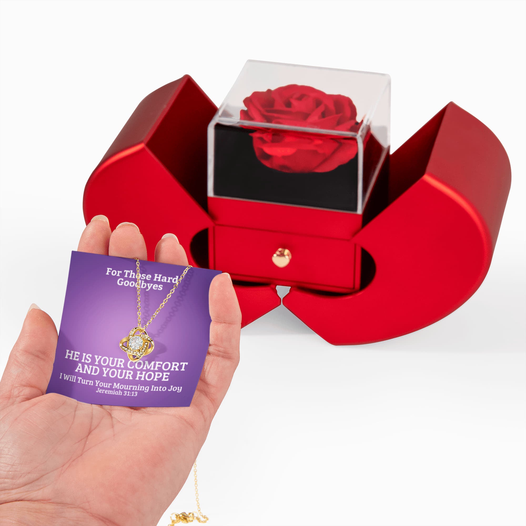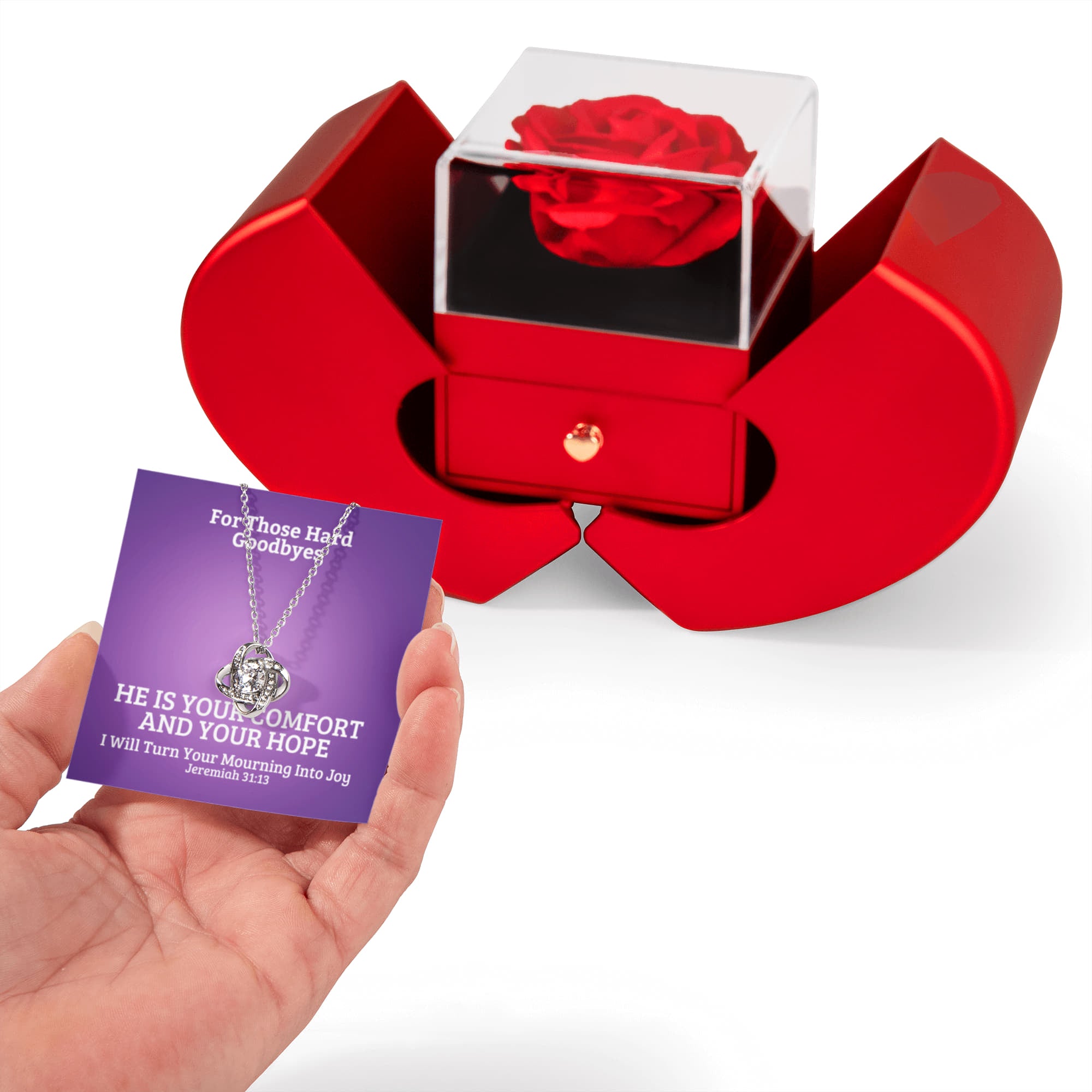 I Will Turn Your Mourning Into Joy (Jeremiah 31:13) | Love Knot Necklace in Red Heart Rose Box