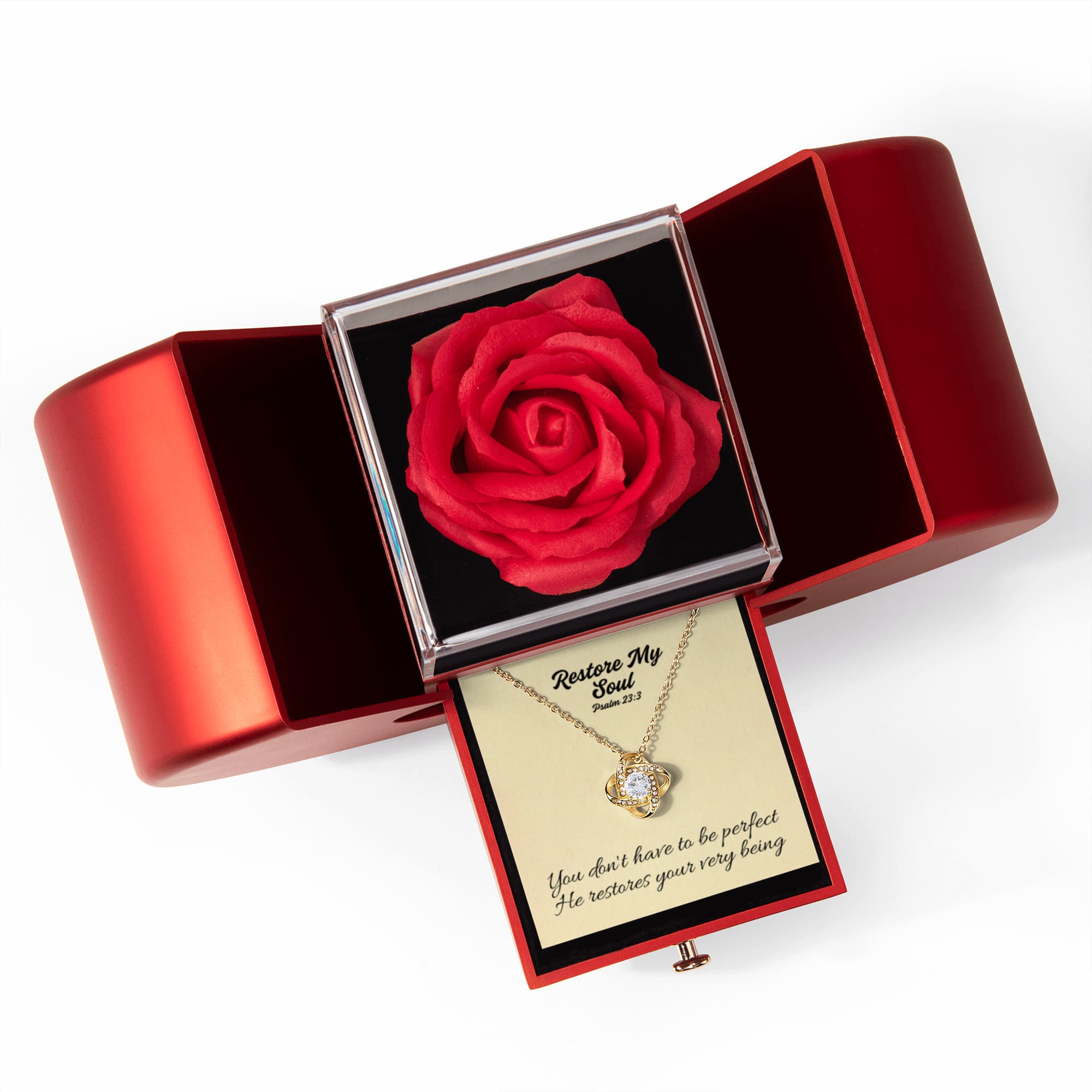 Restore My Soul (Psalm 23:3) | Love Knot Necklace in Red Heart Rose Box