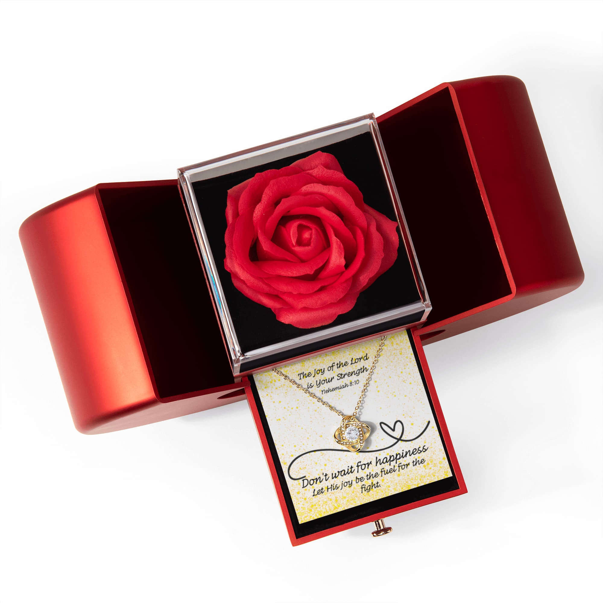 The Joy of the Lord Is Your Strength (Nehemiah 8:10) | Love Knot Necklace in Red Heart Rose Box