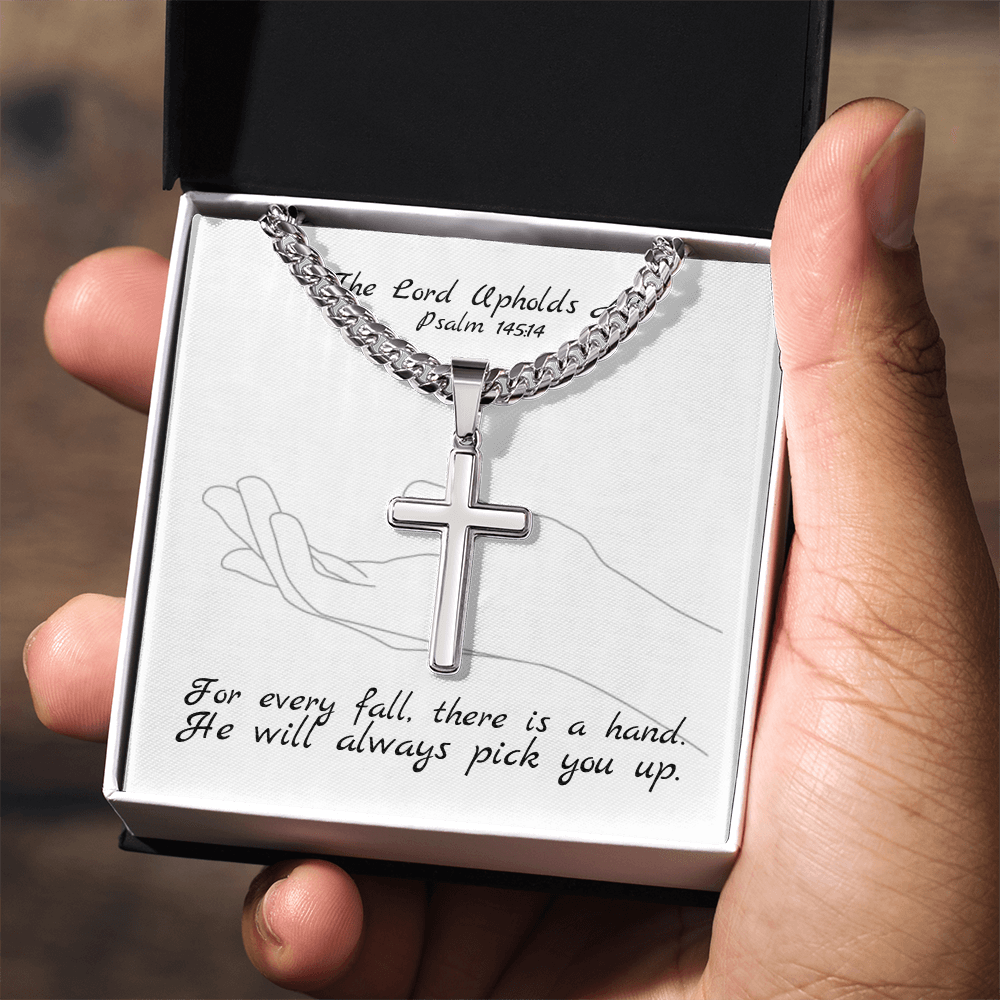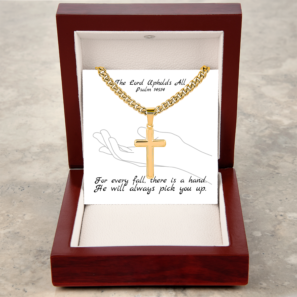 The Lord Upholds All (Psalm 145:14) | Premium Sterling Silver Cuban Link Cross Necklace