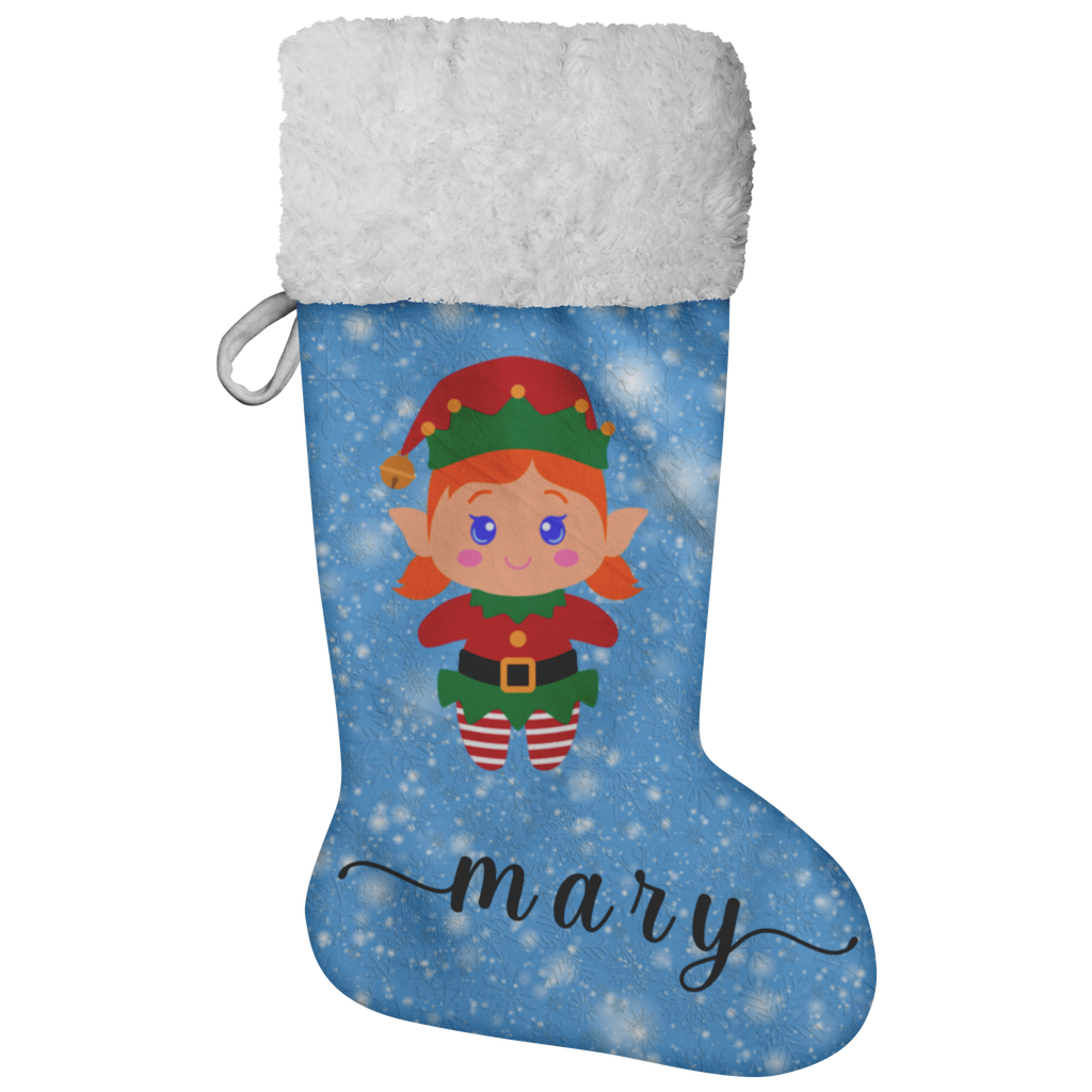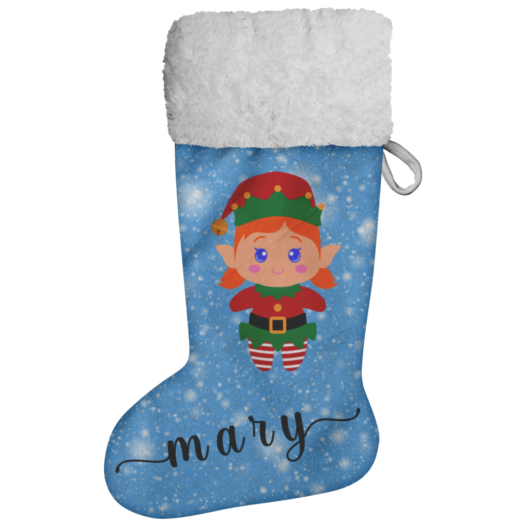Personalised Name Fluffy Sherpa Lined Christmas Stocking - Elf Girl (Design: Blue)